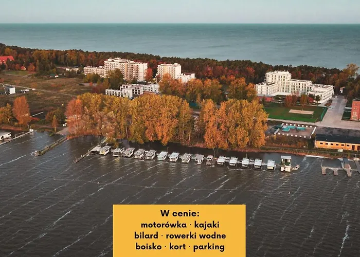 Com piscina, o apartamento Ht Houseboats - Domki Na Wodzie - Sauna, Lake View Mielno de 7 quartos está situado 4.5 km de Plaza Mielno. A uma distância de aproximadamente 10 minutos a pé do apartamento encontrará Rope Park Toucan.